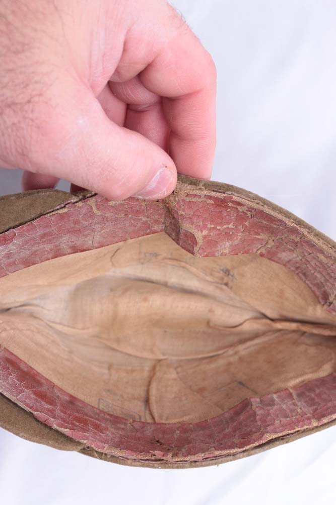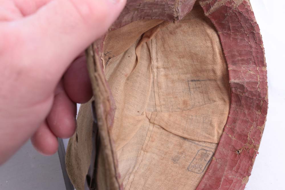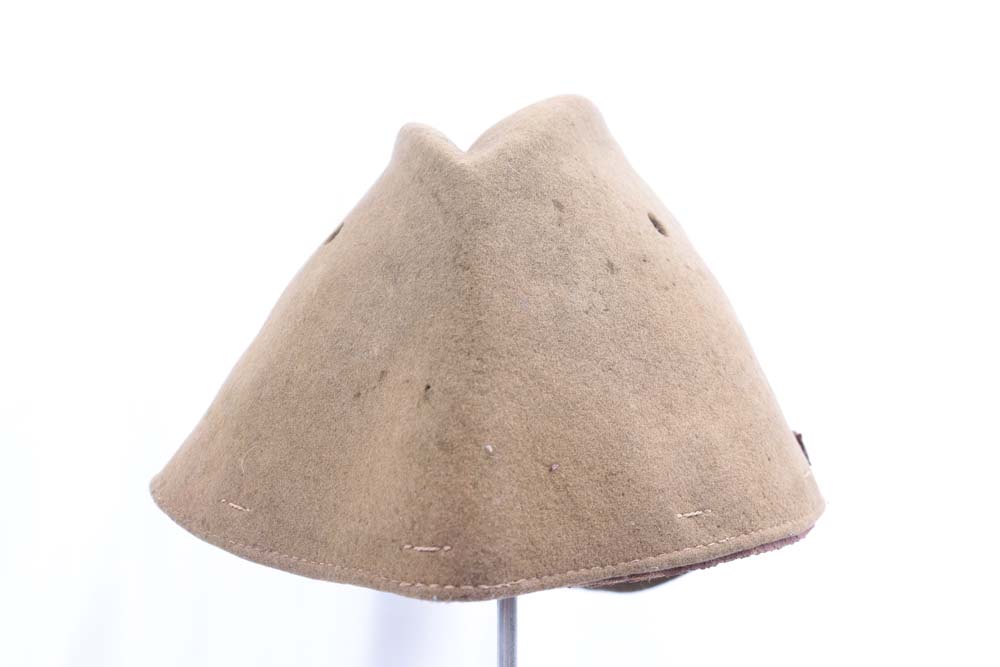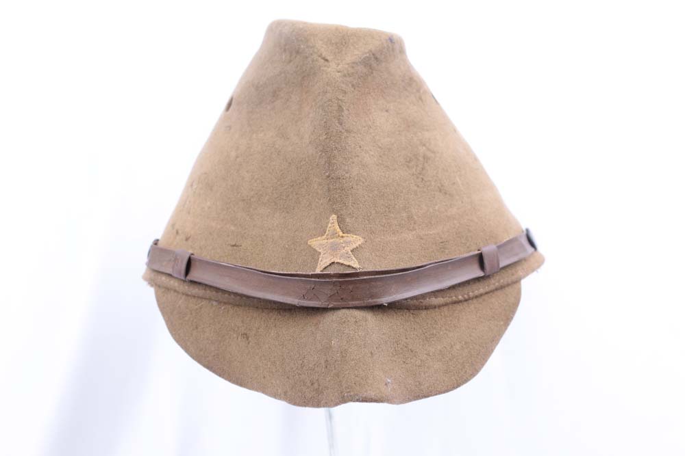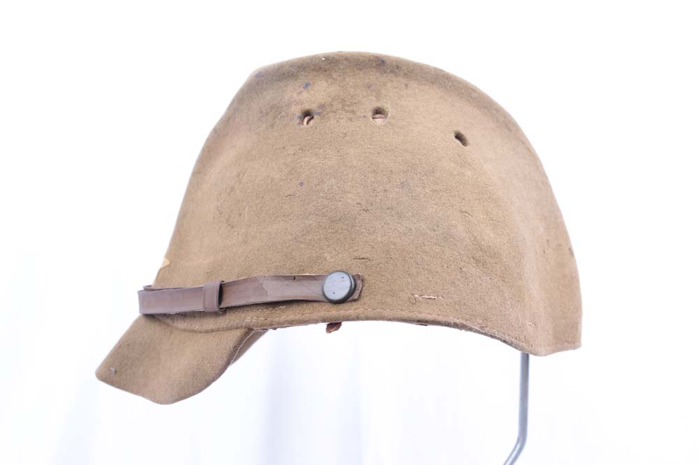 A WWII Japanese Army felt combat cap, issued from 1937–1940 and often worn through the end of the war. These were used alongside the wool caps but were phased out for unknown reasons. Two variations exist: an early type with a separately sewn felt bill, and a later type formed from a single blocked piece including the bill. Most examples are heavily mothed, but this one remains in very good condition.