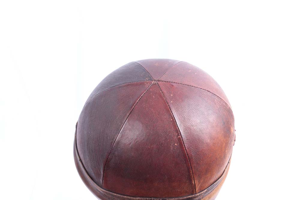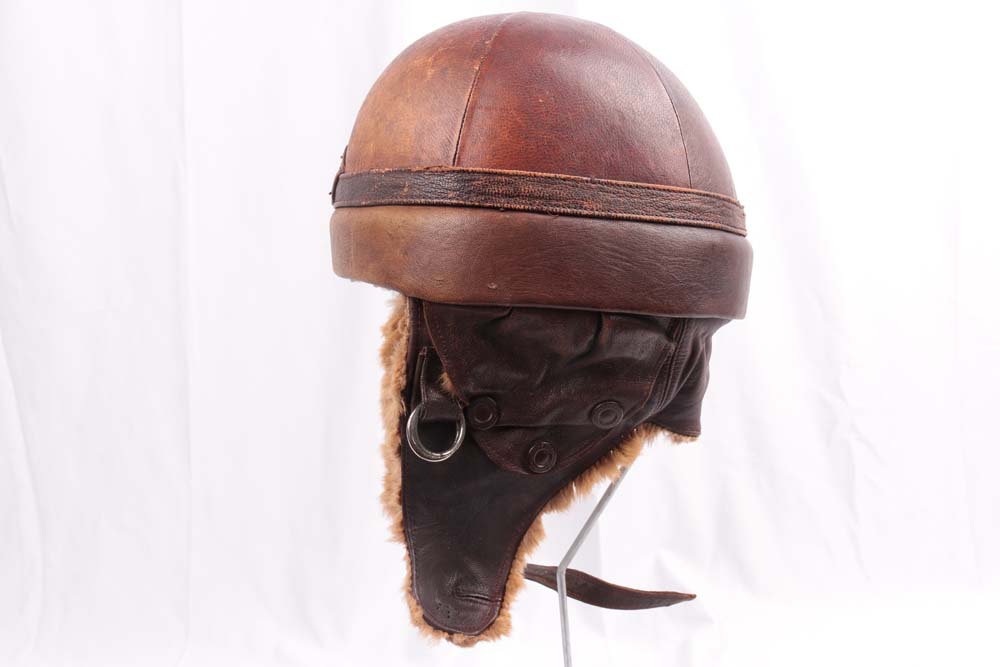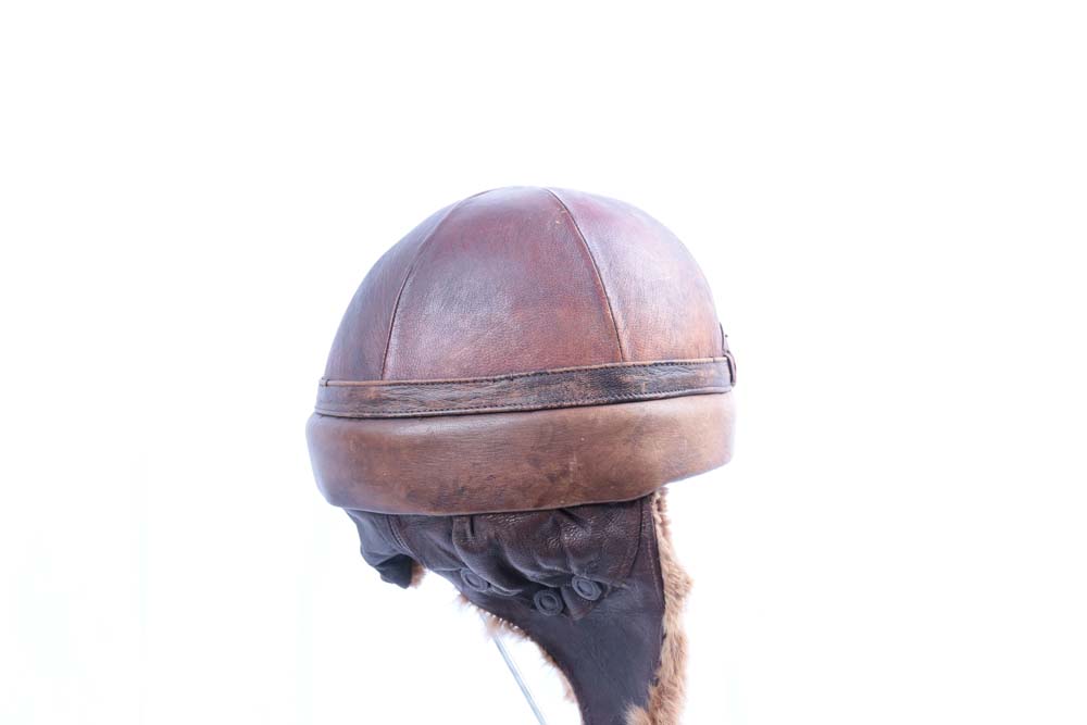 The helmet features its full padded construction with original interior fur completely present, soft, clean, and undisturbed. The suspension liner is fully intact, showing only the lightest signs of age and absolutely no structural compromise. All exterior components remain original to the piece, including the chinstrap, which is complete, supple, and still fitted with its D‑ring fasteners—a detail often missing or damaged on surviving examples.