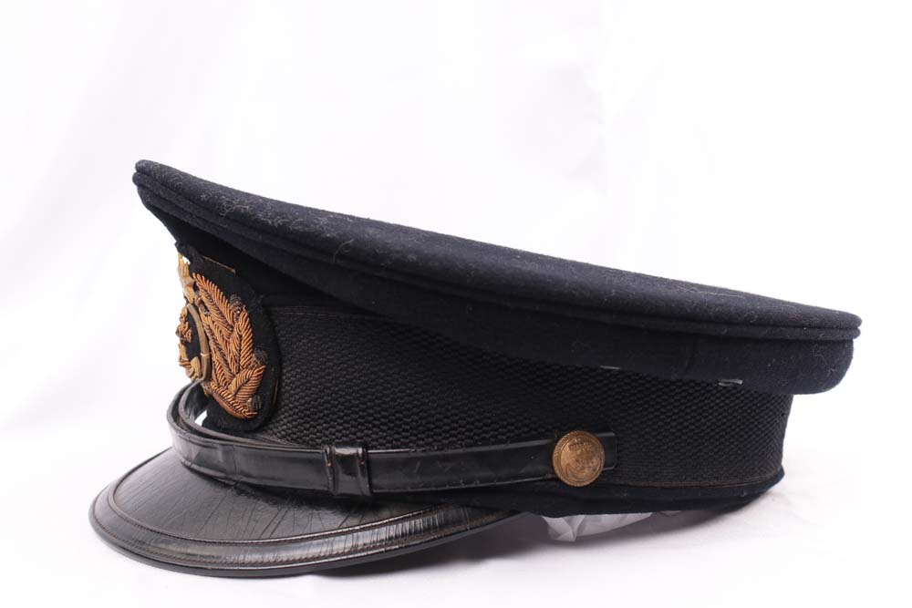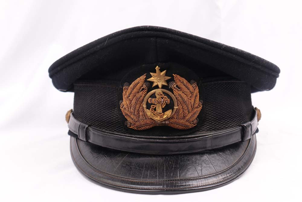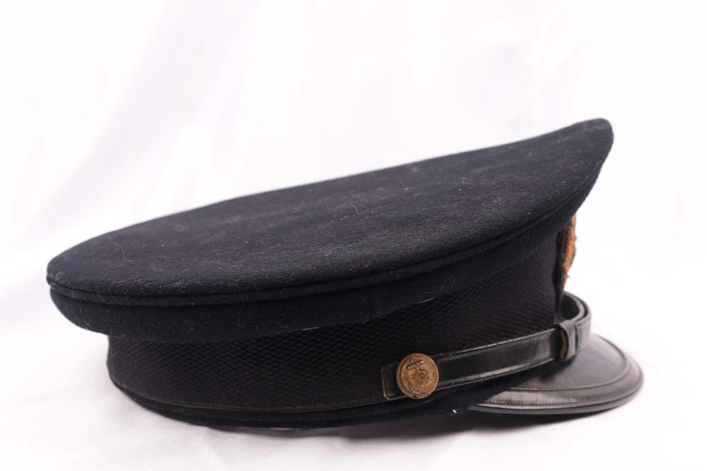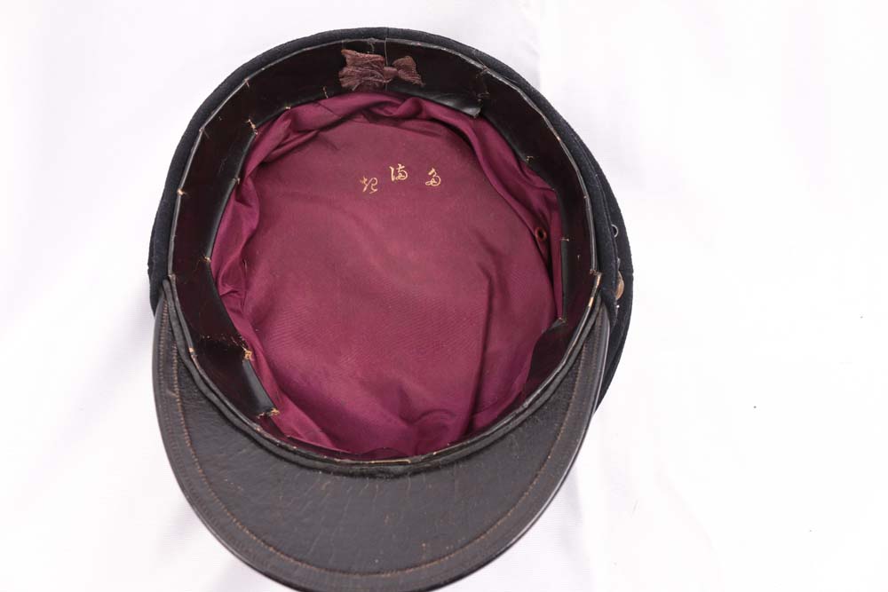 WWII Imperial Japanese Naval Reserve Officer’s visor cap. Reserve issue headgear closely follows standard IJN officer dress while showing the subtle distinctions associated with reservist equipment.