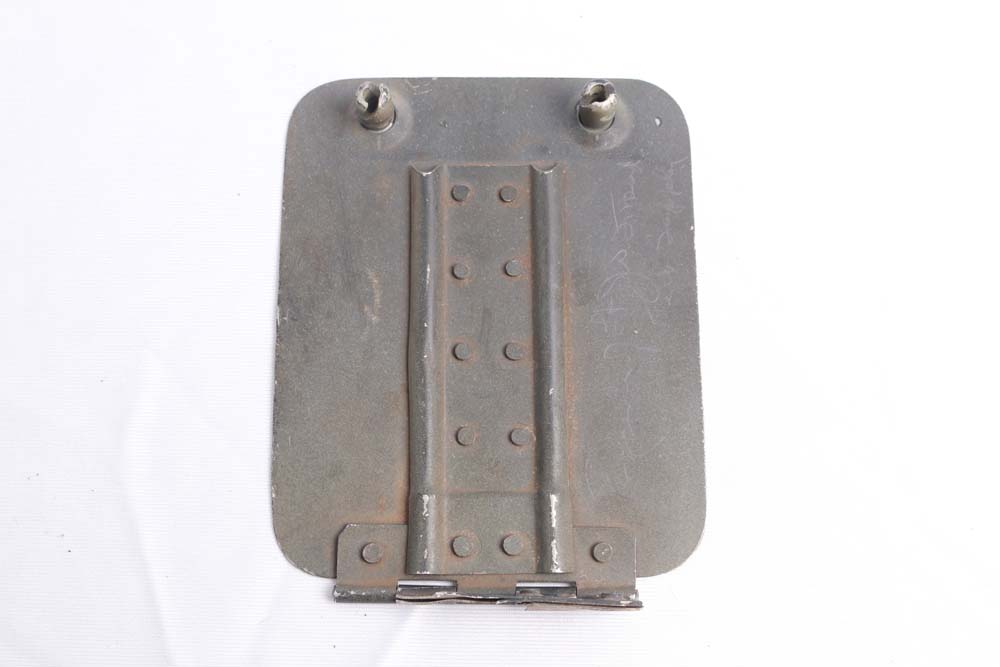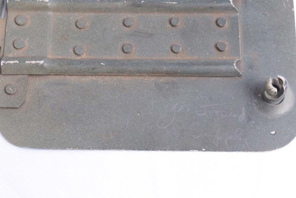 Japanese warplane access panel, measuring approximately 5.5 x 4.5 inches. The panel is painted in green, with darker green overspray concentrated along the upper section—likely a field-applied camouflage, I’m not sure if it is army or navy or which aircraft it came from. The panel features bottom-mounted hinges, consistent with access points for inspection or servicing on Japanese aircraft fuselages or engine compartments.